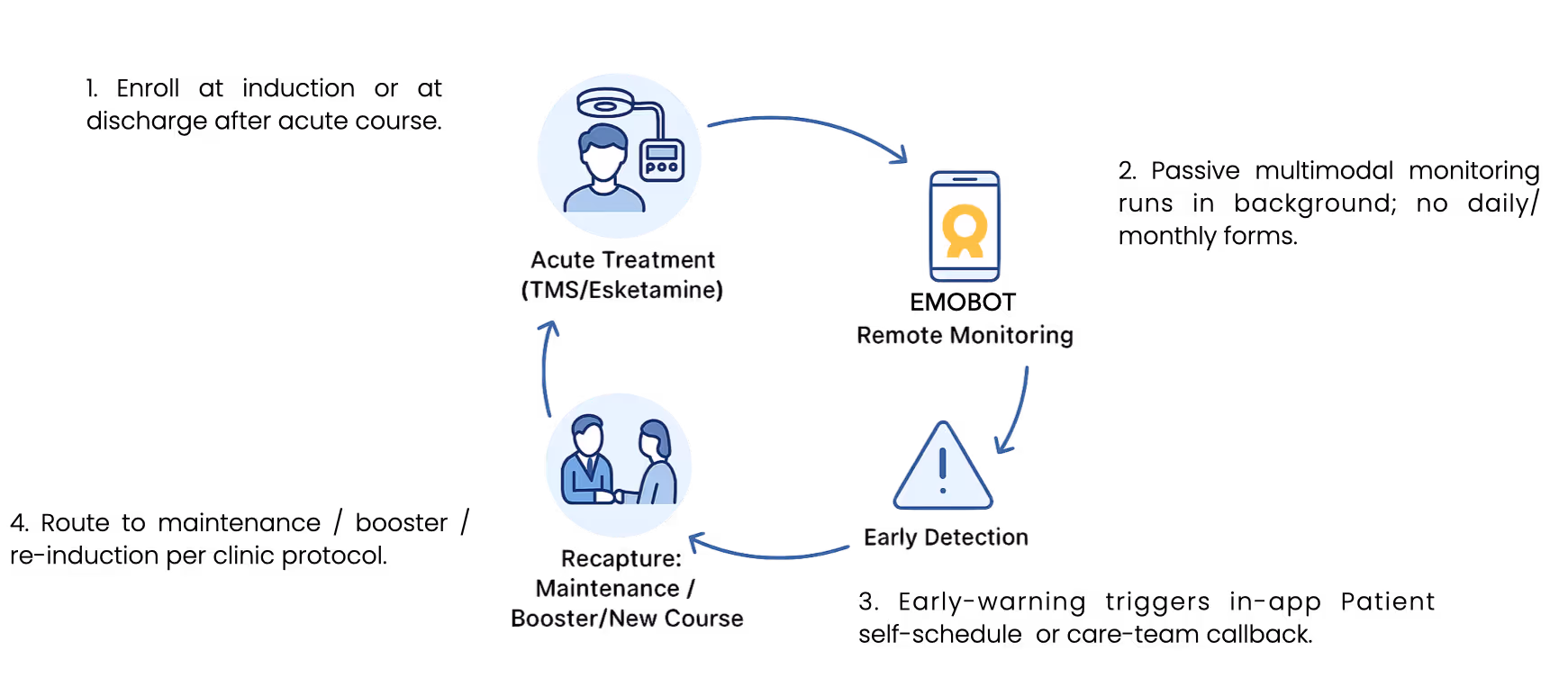 Emobot is a passive, multimodal AI monitoring platform specifically designed for clinics providing Neuromodulation and Esketamine. Detect non-response and relapse in just 2 days—not weeks.